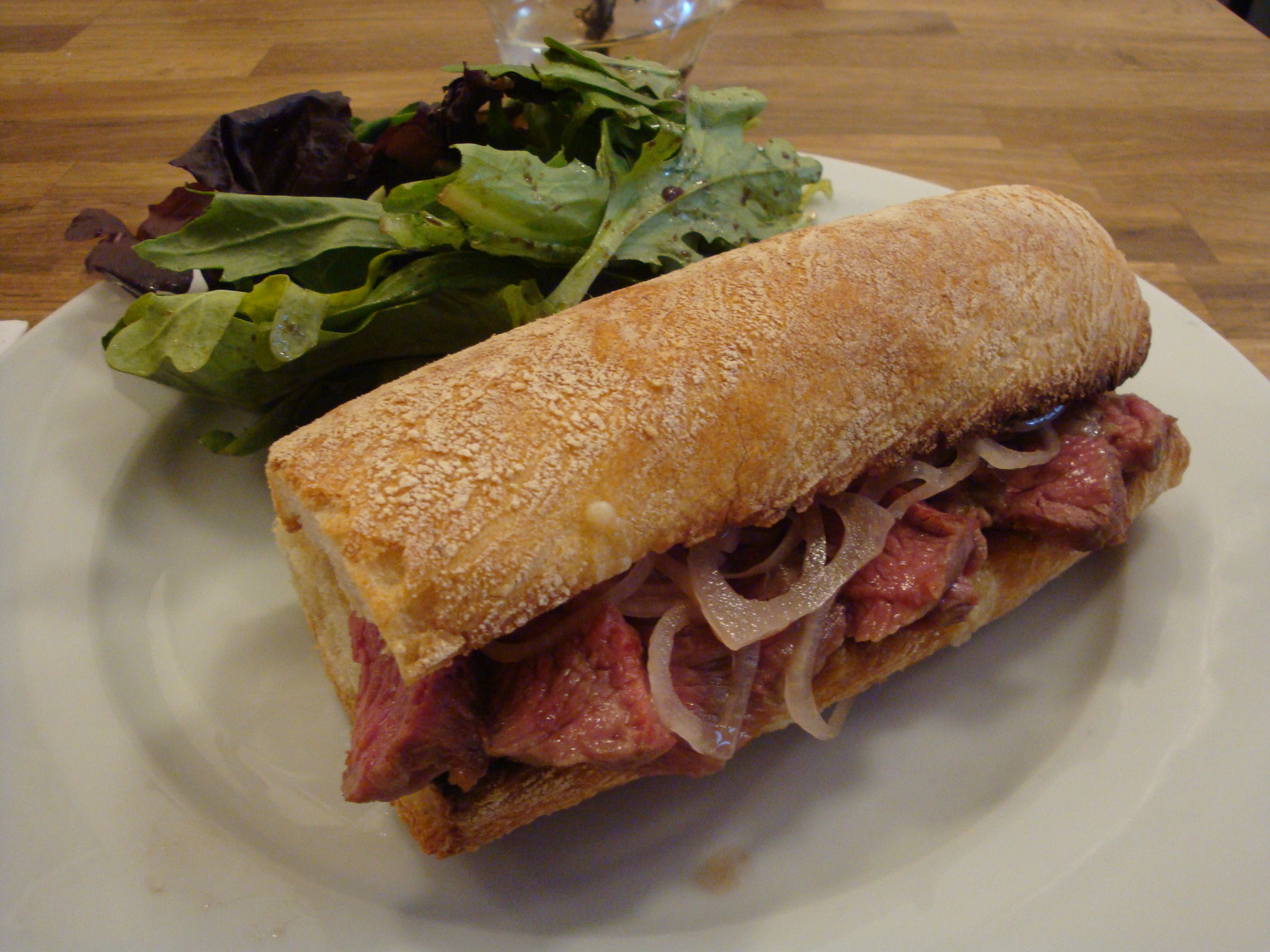 It doesn’t say so on the Web site, but they don’t have all of the sandwiches listed there at any one time. If you have your heart set on something like I did, it might be best to call ahead. My second choice was the braised short rib sandwich, but they were out of that, so I went with one of Mark’s suggestions and got the flank steak sandwich ($9) with shallots and gruyere. Yes, this is a $9 yuppie sandwich, but it comes with some roughage and it was a decent size and actually had a lot of grilled flank steak.
