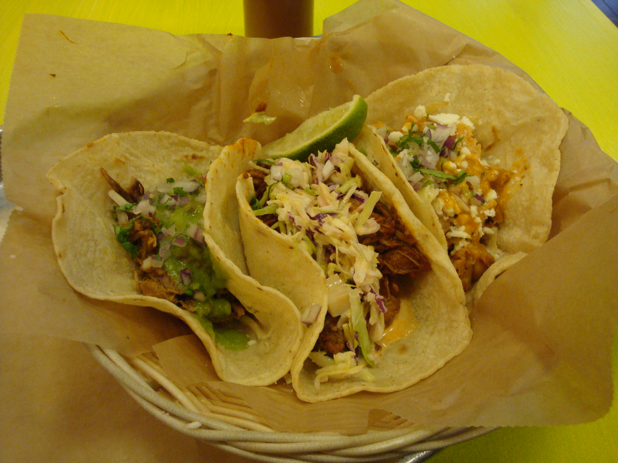 They let you mix and match taco fillings, which worked out well for review purposes. There’s a good selection of fillings and I went for one chicken, one Mexican chocolate glazed pork and one suadero (negra modelo braised brisket). The pork and chicken were both really good, and my least favorite was the brisket because it was pretty dry. I kicked myself after I had ordered and noticed there was a huitlocoche filling way down at the bottom of the wall menu along with tilapia. The corn tortillas didn’t disintegrate even though there was only one per taco.