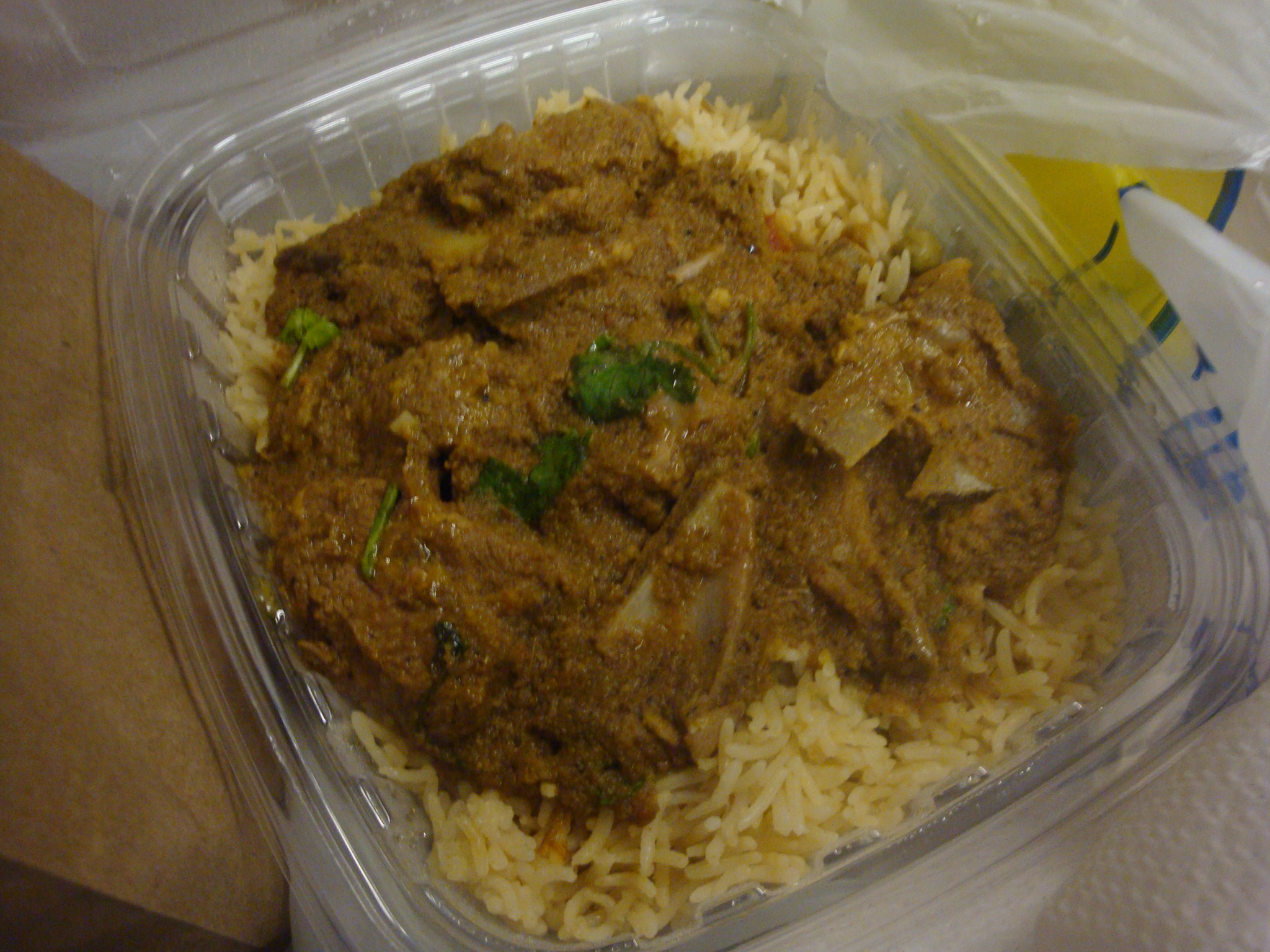 I went with a samosa because I’d heard they were good, and they were also only $1. My favorite part of getting lunch from here was when the guy working threw it in the microwave on the counter before giving it to me. He did the same with my lamb curry a minute later. The samosa was filled with potatoes and vegetables and it was spicy and delicious. If you fear grease, this may not be for you because the paper bag it was thrown in was nearly transparent by the time I ate it. Then again, if you fear grease, you would probably not be getting lunch at Lahore Deli.