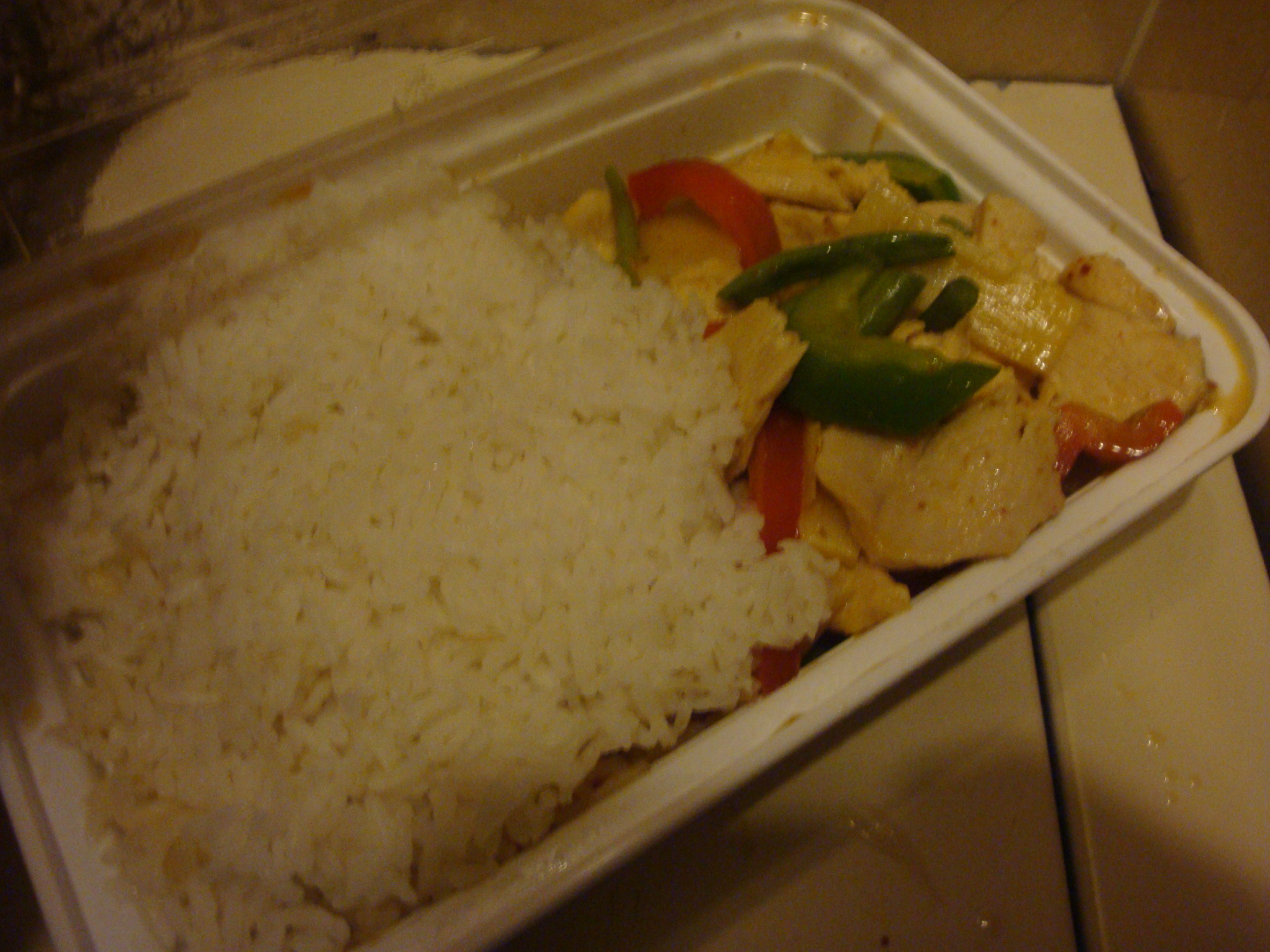 I could smell the food all of the way back to my office which I thought was odd since it was in both paper and plastic bags. When I went to take out the container I discovered why – all of the Indonesian peanut sauce goodness had leaked out into the paper bag! This was sad because it left little sauce to soak into the rice.