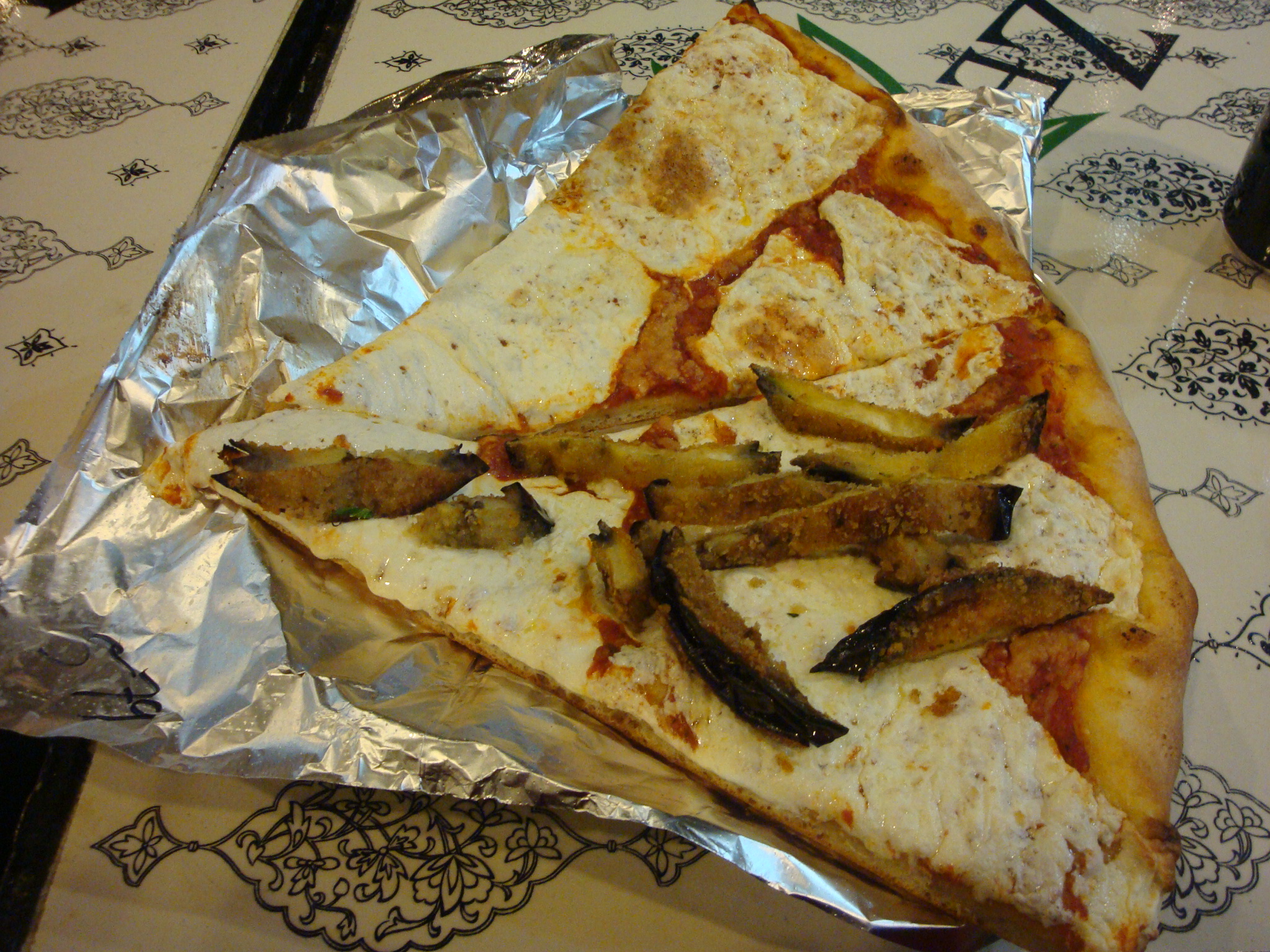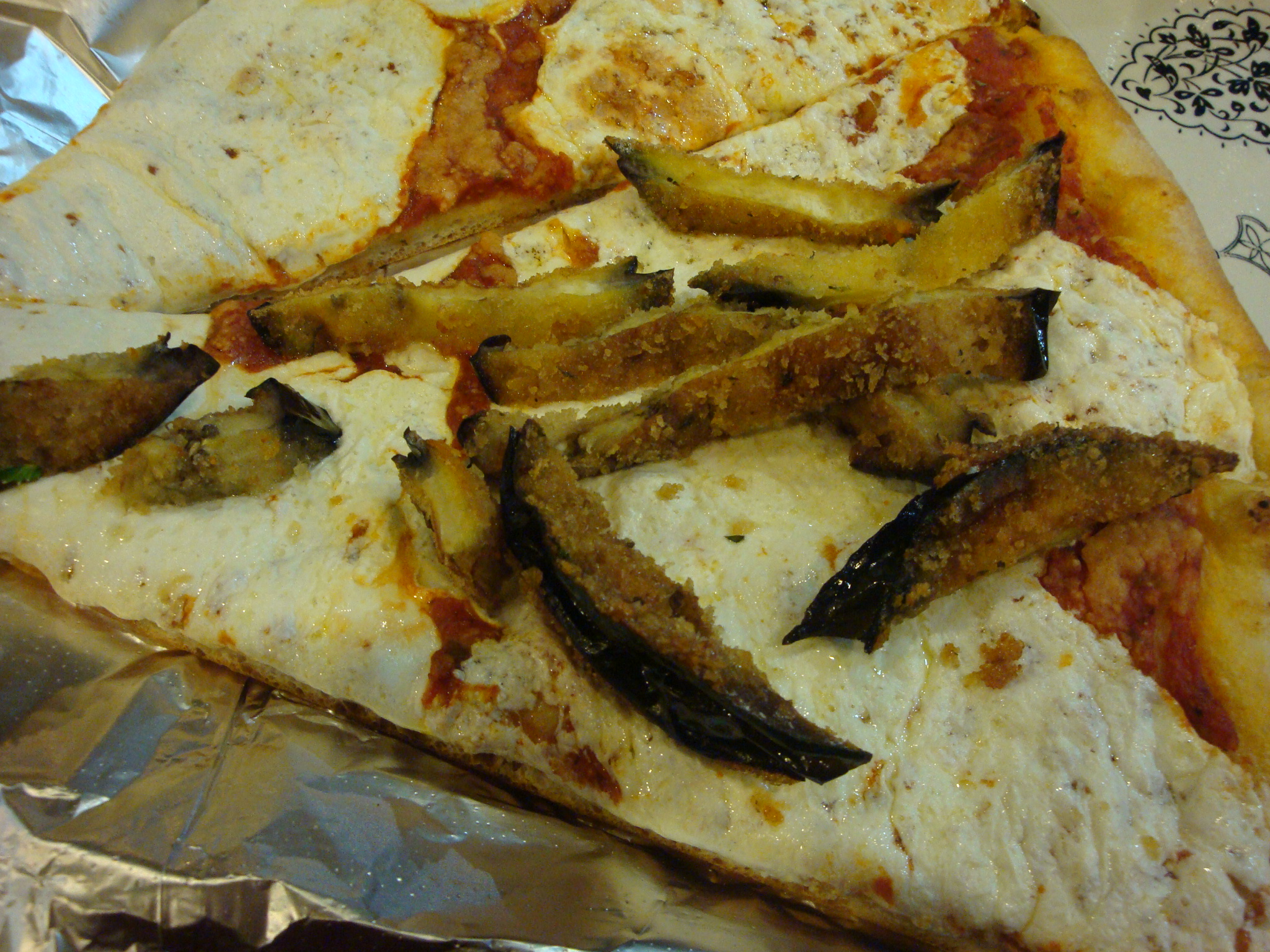 I really liked the slice with the fried eggplant, which I wasn’t expecting to. The only downfall is the eggplant wasn’t exactly stuck to the cheese so it tended to fall off. Really, though, how many complaints can you have about fried food placed on pizza? Compared to this slice, the plain one was somewhat lacking. The sauce and crust were really good, though.