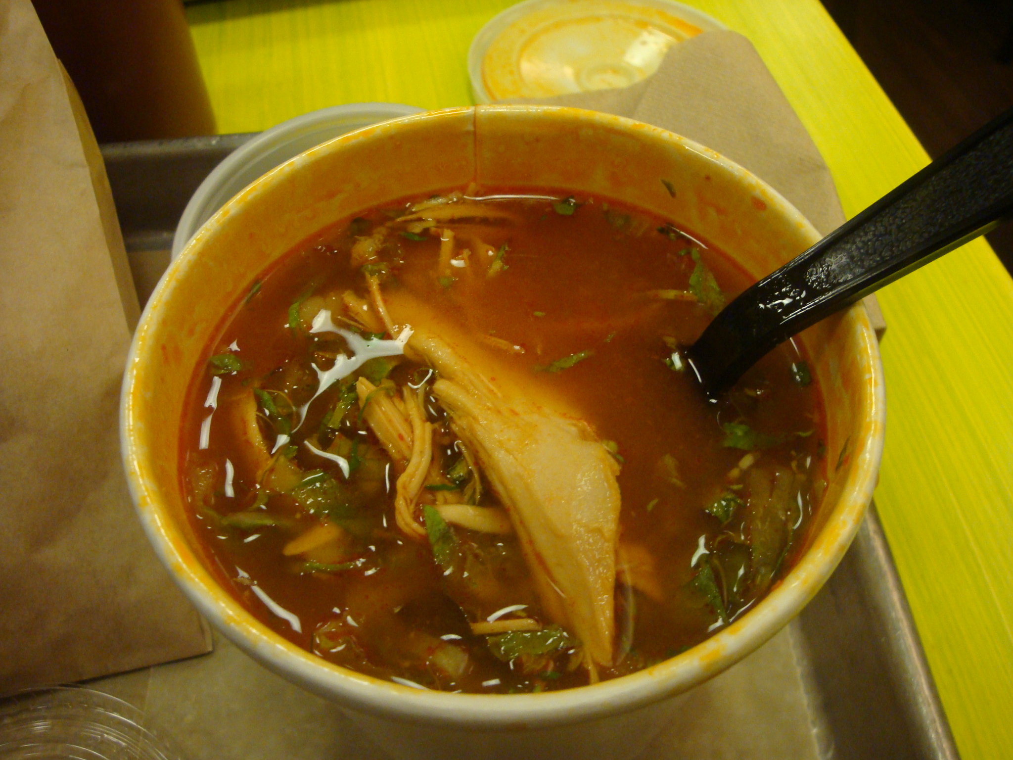 Back to the soup. In addition to the pozole they also have tortilla soup for the meat-averse out there. They only come in one size for $3.21, but it’s the equivalent of the large you get at most crappy delis and other soup places, so not a bad deal at all. To round it out I got a small chips and guacamole ($2.76). Together they were $6.50 for what turned out to be a good alternative to the usual soup/bread combination.