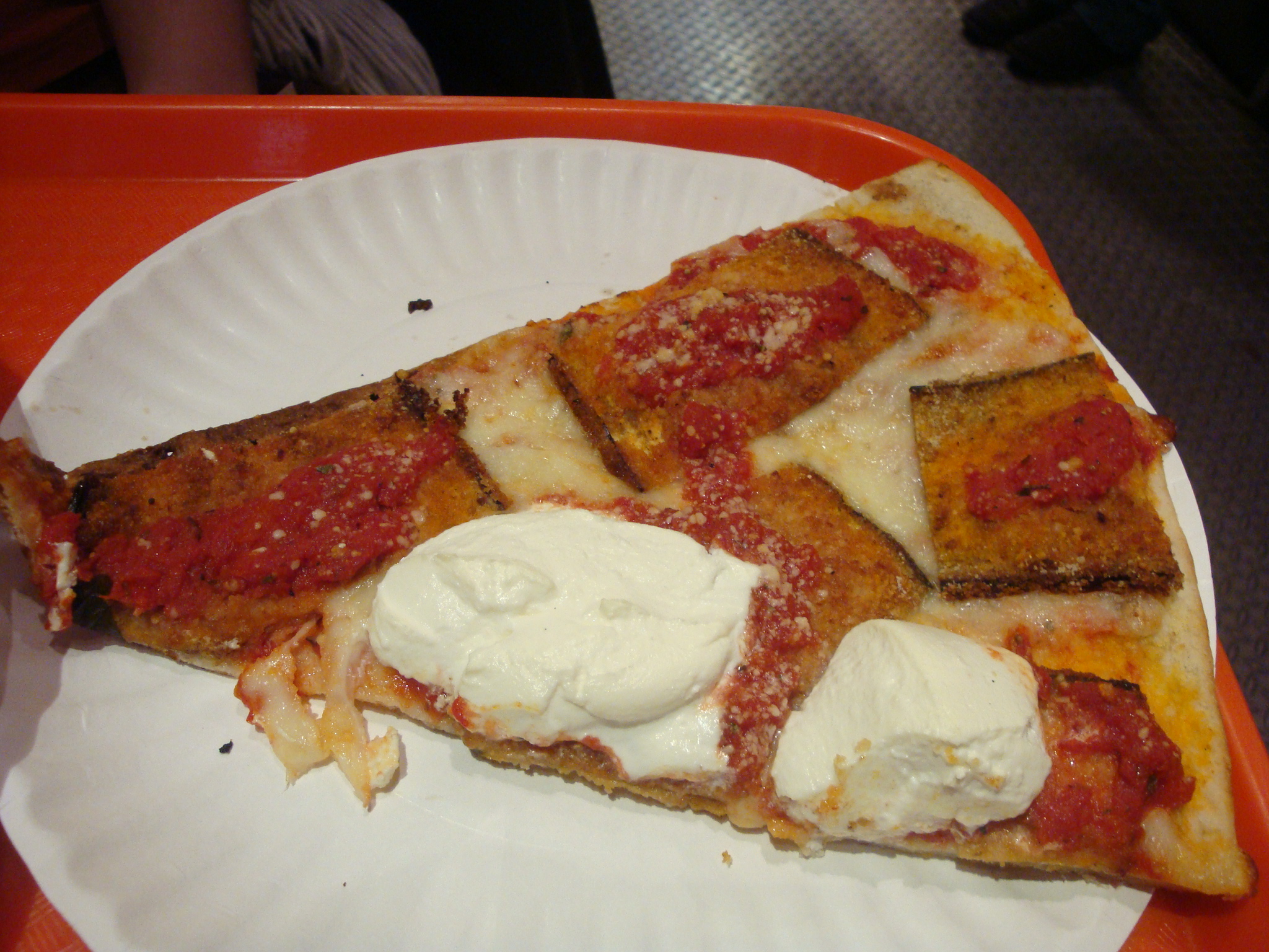 My co-lunch’er did just that, going with a cheese slice (which they confirmed was still delicious) and an eggplant slice ($2.75). The eggplant made the slice a hefty one, but it looked good if you don’t have a problem with fried food, ricotta and cheese piled on your pizza.