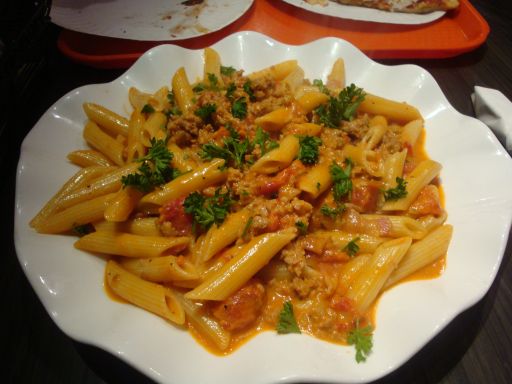 My first thought was that the giant bowl of pasta looked better than what you get in some restaurants for twice the cost – or at Hello Pasta for half the amount of food. And holy crap, they didn’t skimp on the sausage and bacon! Sure, eating this on a regular basis might make your heart explode, but it really didn’t seem any more unhealthy than downing a couple of slices of pizza.