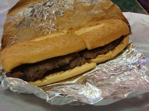 I unwrapped the sandwich and found it was a decent size for what I paid, and had plenty of steak in it. It had been marinated and was really good, but be warned that there was also a fair amount of crushed red pepper on it and some heat to go with. If you’re a hater of onions you can either get it without or not worry about it because there aren’t a lot there. And I’m sure if you asked nicely they would add some cheese. Also, I got a pickle with mine, but the counter guy asked if I wanted coleslaw or potato salad with and didn’t say anything about charging me more. So you’re getting a good amount of food here.