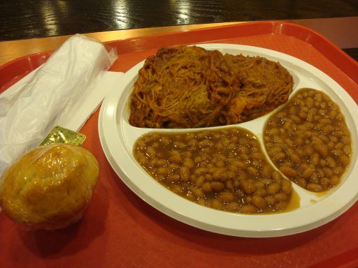 A lot of people seemed to be ordering either burgers or wings. This did not give me a lot of confidence in what the barbequed meats would be like and soon enough I was handed my tray of brown. There was a giant mound of pulled pork covered in BBQ sauce and then a crapload of baked beans that I’d chosen as my side. I was a little annoyed at this because couldn’t they have let me choose two sides instead of giving me two servings of one? And you also get a shrink-wrapped corn muffin which thankfully wasn’t brownish-red.