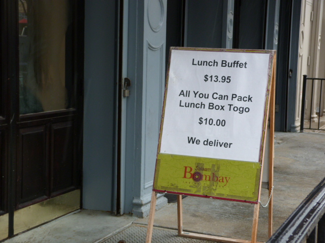 Normally I don’t get excited about sign boards outside of nice restaurants, but the one at Salaam Bombay on Greenwich (at Reade) called to me. They’re basically asking me to go in there, grab a to-go container and try to cram as much stuff in there as I can while still being able to close it. And it’s not even a by-the-pound situation, meaning I don’t have to skimp on the rice! I see a return trip to Tribeca in my future…