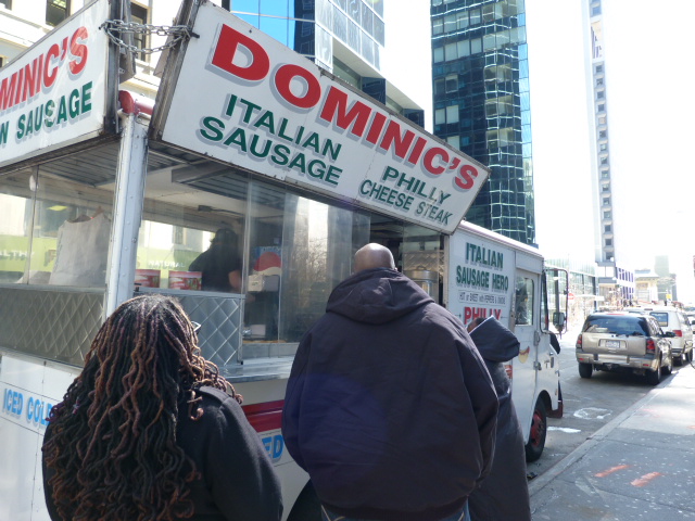 A couple of weeks ago I noticed that Dominic’s Truck was parked in the same spot every day on Whitehall (nr. Water) serving cheese steaks and Italian sausages and that’s about it. I asked you lunch’ers if it was worth a shot, and you said yes (although not if it’s a long hike). On a day when a nice greasy lunch that would likely give me heartburn sounded good, I headed down to see what Dominic was cooking up and just how much his food would set me back.