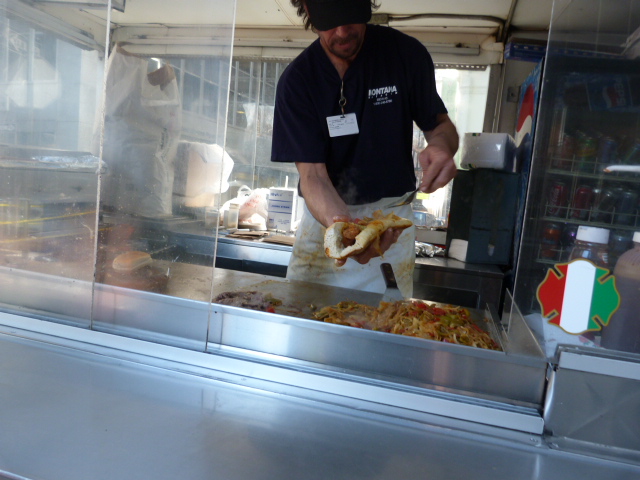 Like a couple of you guys said, the cheese steak isn’t the usual variety. I saw him cooking one and it was a really thin piece of steak that he cooked on the grill and then put on a bun with the peppers and onions and some cheese. It’s the same price as the sausage sandwich so if a steak sandwich sounds good to you it’s a pretty good deal.