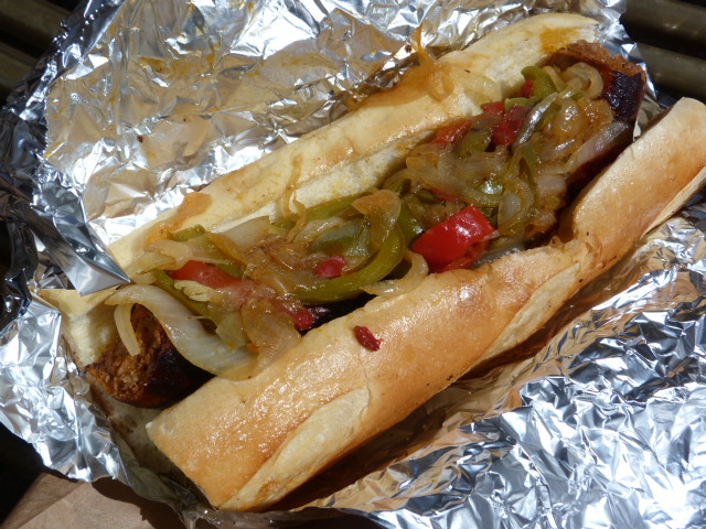 There’s only one guy working the truck (Dominic, I presume?) and he’s good at multi-tasking. He essentially has only three things on the “menu” of which there isn’t one posted. There’s the cheese steak and hot or sweet Italian sausage (all $7.50) and hot dogs. The guy behind me in line ordered a hot dog and then told me that since it’s cooked on the same grill as everything else it tastes like an Italian sausage for less calories. Now that’s a diet I can get behind! He also has a pile of onions and peppers going on the grill that get shoveled onto pretty much everything, as well as ketchup, barbeque sauce or hot sauce if you desire.