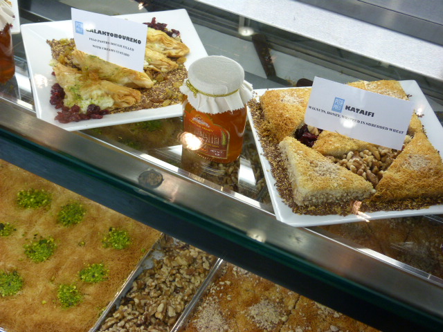 It’s a small space with some seating off to the left. The first thing that struck me was the amount of choices for food was a little overwhelming. You can get pita sandwiches or a platter with meat (lamb, pork, chicken two ways, bifteki), vegetarian (zucchini feta fritters) or vegan (tomato mint fritters with fava bean dip) options. Then there are six side options if you get a platter, desserts and Greek yogurt smoothies.