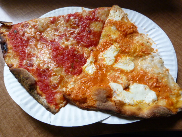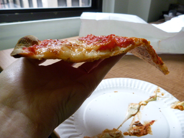 A lot of places open in SoHo and Nolita but it’s often sad scanning their menus because more often than not everything on them is $10 or more, even at lunch. There are ways around that by going vegetarian or ordering nothing but a sandwich but sometimes it’s nice to eat somewhere a little nicer but still at ML prices. Rubirosa opened on Mulberry (btw. Prince & Spring) – an outpost of a beloved Staten Island bar pie purveyor – but sadly the cheapest pizza on the menu is $14 for a small and there is no mention of slices. But then I saw that they were named the best slice of 2011, and that there was a way to get a cheap lunch here after all.