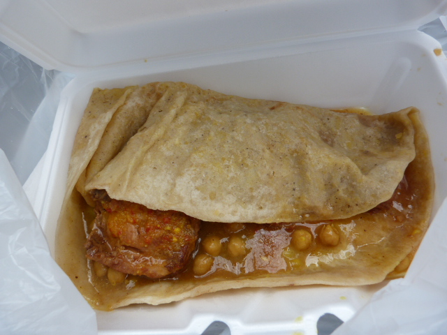 Once I opened the container it was all I could do to snap a couple of photos before devouring that roti. The chickpea curry was amazing on its own but the chicken was stewed so it was falling off the bone. Yes, you can’t really eat this thing like a burrito unless you take all of the chicken off the bone and even then it’s going to be a messy, saucy proposition. Instead I ate the chicken first and then tried to wrap up the roti and eat it with the remaining filling most of which ended up all over my hands and face. You might not want to eat this on a lunch date.