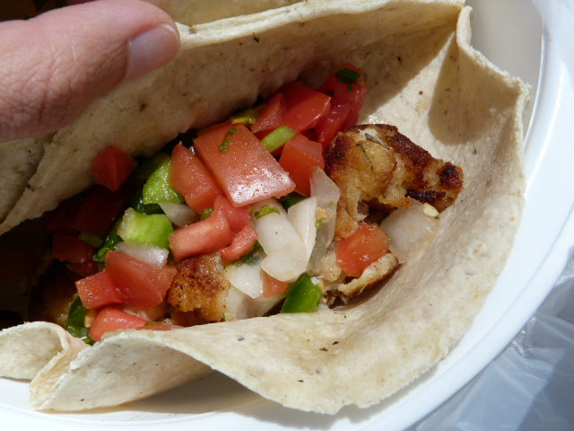 The clear winner of the three for me was the fish. It was fried and seasoned just enough and the tomato, onion and green pepper alongside were great. The pork was juicy but a little bland and the bean and avocado was more salty white cheese than anything else. The awesome chipotle salsa they give you helped out any flavor issues. These are single tortilla affairs (griddled, not steamed) which was fine since I ate my food right away. I would imagine if you waited 15 minutes they may get soggy and fall apart.