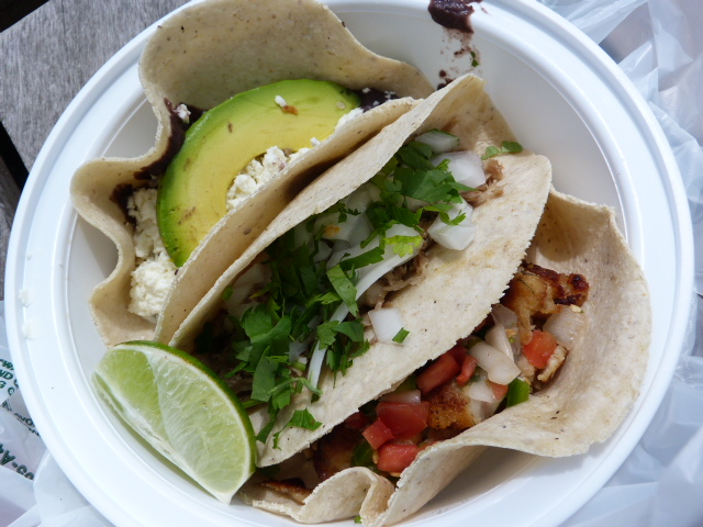 But what about the food, you ask? I went to order a tamale and was told they were out until later that day. So it was on to plan B which was a trio of tacos: one pork, one fish and one bean and avocado ($2). They have a good variety including nopales, barbacoa, carnitas and shrimp. Most are $2.50 except the seafood ones which are $2.75. My total came to $7.25 which is a steal compared to most places where you’d pay $9 for the same amount of food.