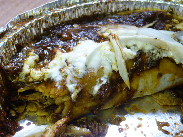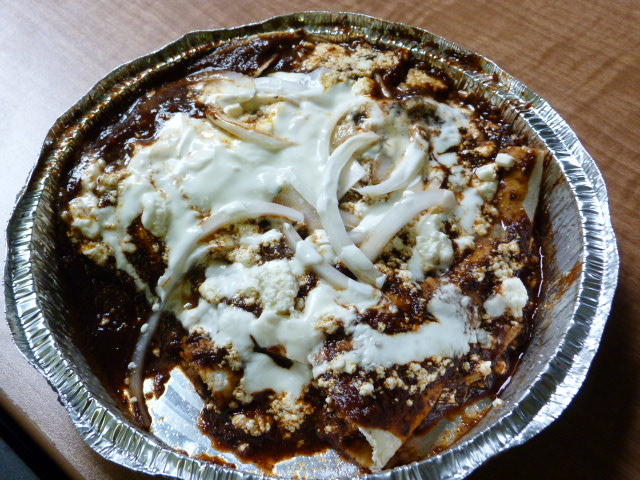 The kiosk now has a menu posted on the side and has a proper sign. The first time I was at Nixtamalito they were out of tamales, and it happened again! I would call it bad luck, but I think it was just the crappy weather, because why make a bunch of tamales you’re not going to sell? The tortas sounded tempting but instead I ordered one of the special plates – chicken enchiladas with mole sauce ($8).