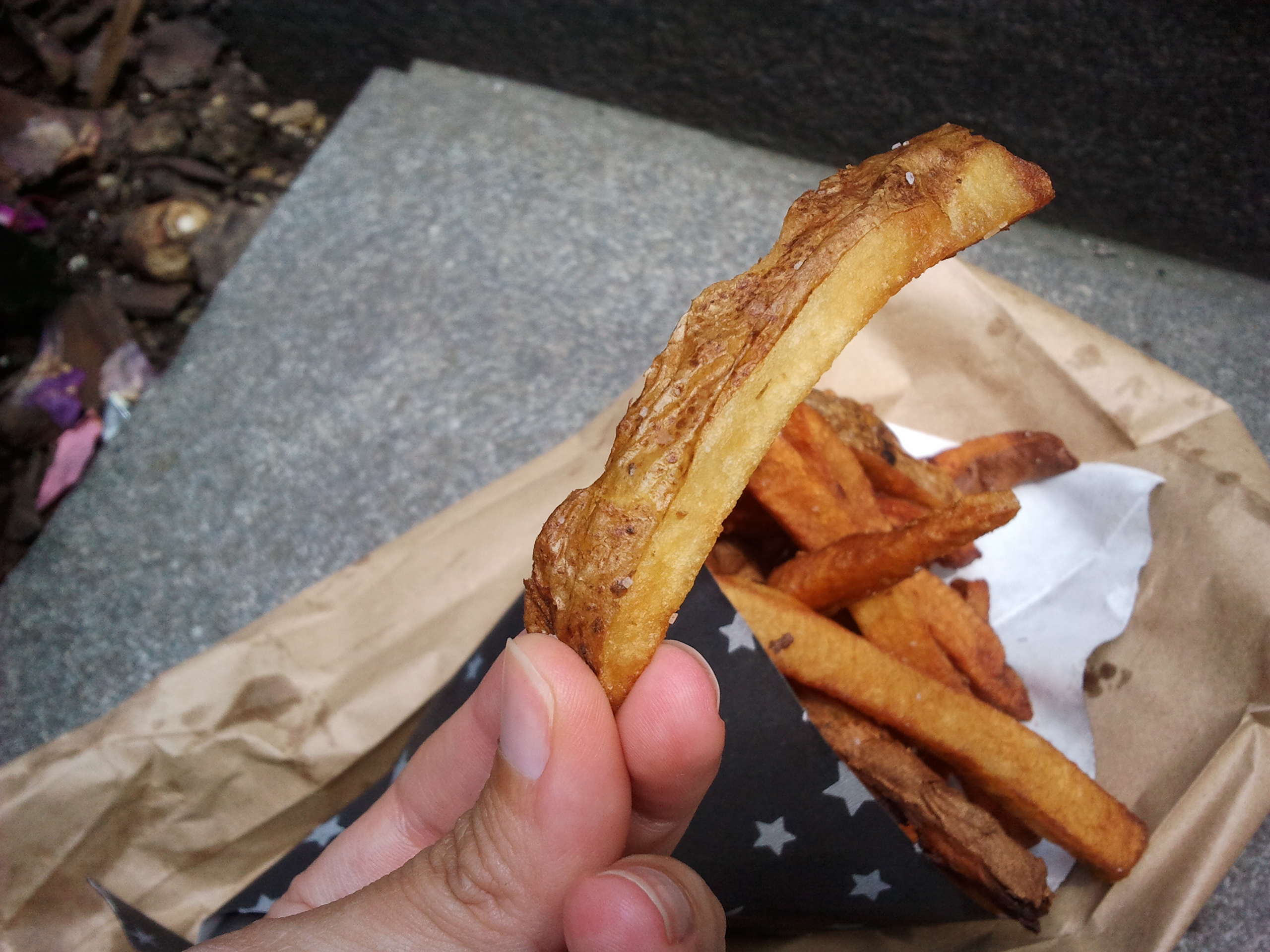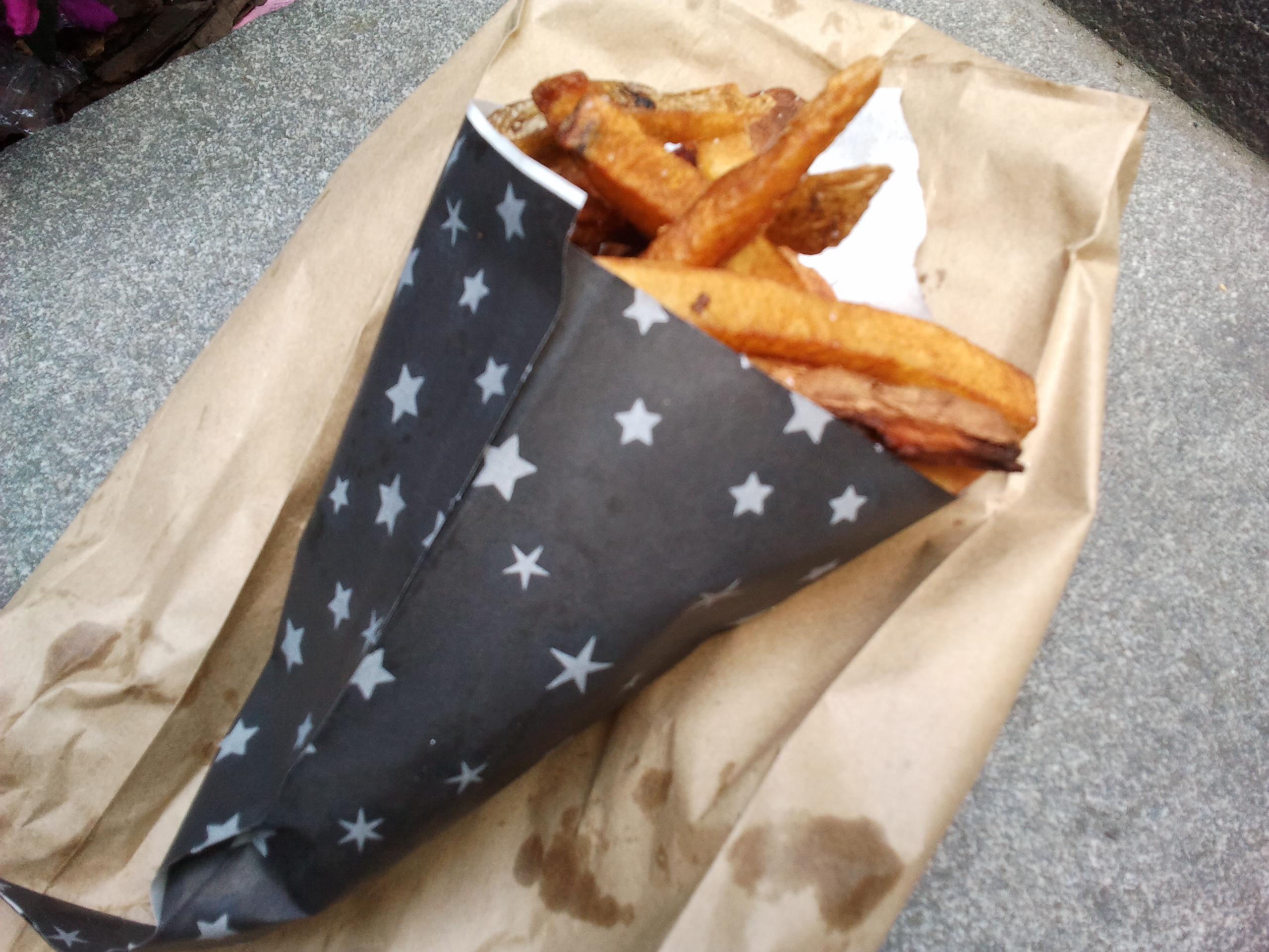 I don’t know if it was the fact that they only serve fries, that it was about 1:30 or that you guys are just hitting the wall when it comes to new food trucks, but there was no line. The menu is pretty simple: Belgian frites in regular or sweet potato form that come in three sizes, and a list of sauces to choose from. The sauce choices are a little overwhelming as there are technically 18 of them but they don’t every one every day. It’s best to look at your choices online beforehand.