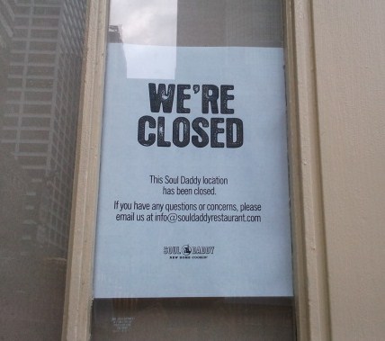 In what may be a record for quickest opening and closing, Soul Daddy – the product of the reality show America’s Next Great Restaurant – is already shuttered after a little more than one month. It was all over Twitter late yesterday and sure enough, when I walked by after work the Soul Daddy flag was still up, but the place was hiding its shame with paper over the windows. I guess not enough people liked whole wheat biscuits and baked chicken.