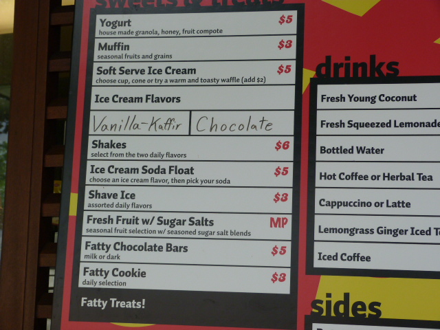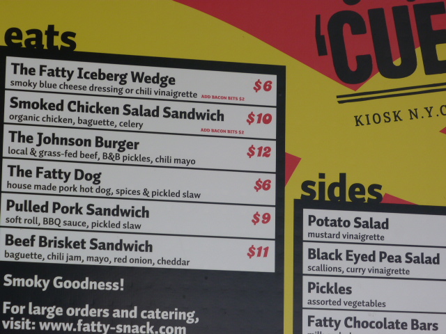 You may remember the long lost Picnick Smoked cart and accompanying two Picnick kiosks in Battery Park. Well, now they are another outpost of Fatty Snack (joining the one in Battery Park City), and a Fatty ‘Cue. There’s not much different here than the BPC outpost, except here the Snack kiosk serves ice cream and sweet while the ‘Cue one sells the sandwiches and other lunch items that seem to already be popular with the tourists. Menus straight ahead.