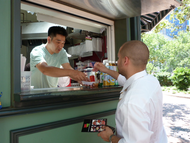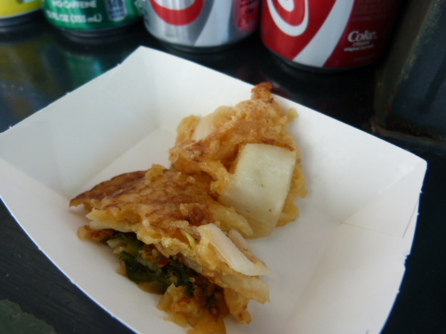 They already sell kimchi pancakes, but will also do a seafood one soon (both two for $4.99), and he was giving out samples of each. I personally liked the kimchi version but if you’re not a fan the seafood one wasn’t shabby either. Later I got a taste of both the bulgogi and chicken dupbap. They were good, but I liked the chicken slightly better.