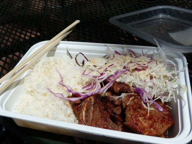I ordered the kalbi over rice ($9.99) which is the most expensive item on the menu. Most other dishes are $8 or less.The kalbi was not only good, but plentiful. It was a little hard to gnaw on with chopsticks so you might want to ask for a fork if that’s a problem since most of the nine (!) pieces were large. You also get a large pile of rice and some cabbage with either honey mustard or raspberry vinaigarette on it. If you want kimchi with any of the dishes it’s an extra $1.