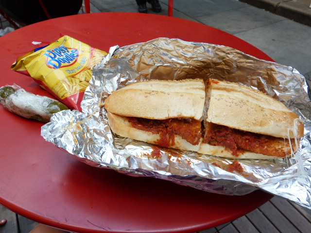 There was only one person in line and the man who had made my previous roast pork sandwich was working, telling me they had a “nice roast chicken” that day. They serve simple food but I like the enthusiasm behind it. Instead I went for that chicken parm sandwich ($7.50), and saw some chicken cutlets being thrown into the deep fryer by the other guy working. I applaud any truck that uses a deep fryer when it’s 90 degrees outside.
