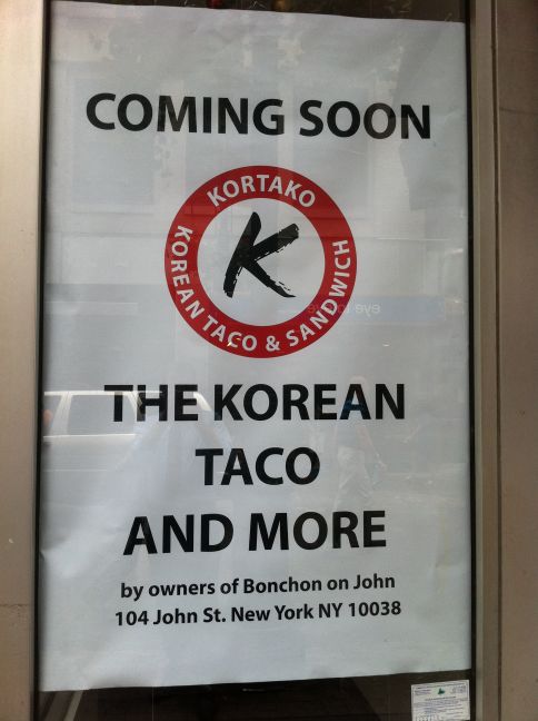 Good news for the upper part of the FiDi that has a far walk for the weekly stops of Kimchi Taco Truck and Big D’s Grub. Lunch’er Justin sent in the above photo advertising the forthcoming Kortako on Nassau St. between John & Fulton. It’s being opened by the Bon Chon on John people and it appears they will sell both tacos and sandwiches. I’ll be curious what they offer for the latter, but really it’s just nice to have something that isn’t a chain opening downtown.