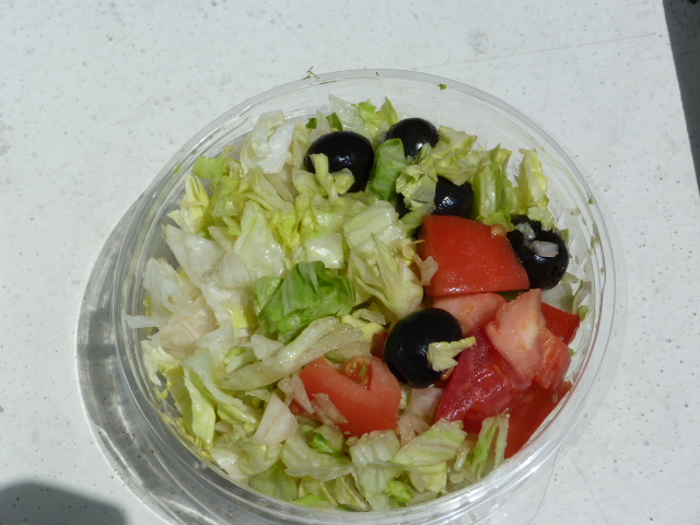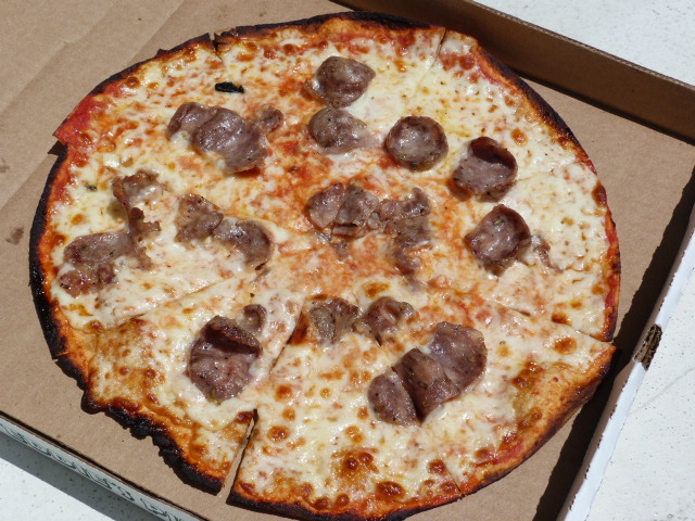As you can see in the above photo, the pizza crust got a little charred in spots. There was one bite I took where there was so much char on the bottom it seemed like I was gnawing on charcoal. I guess when the crust is this thin it’s to be expected. The salad is exactly what you get in most pizza places – iceberg lettuce, some tomato, a few black olives and a container of Italian dressing on the side. I appreciated it for its simplicity.