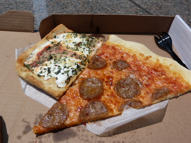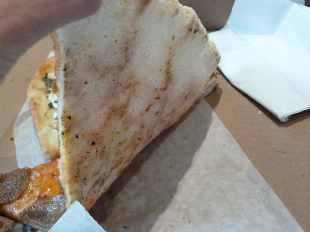 Let’s start with the sausage slice since that was the most obvious offender. The crust had no color and was completely floppy and while I realize it was covered in sausage and cheese, it was super greasy. I realize I may have gotten a bad pizza or something, but at $3.75 this should have been way better.