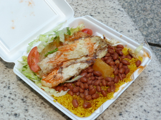 Sometimes when I would walk by Sandra’s Food Spot cart on Nassau (btw. Liberty & Cedar) in the morning there would be a neon pink sign affixed to the front announcing a special of tilapia with rice and beans for $7. It wasn’t until a few failed attempts at snagging this special that I realized they only serve it on Wednesdays (much like the Friday pasteles special), and it’s best to go early if you want some.