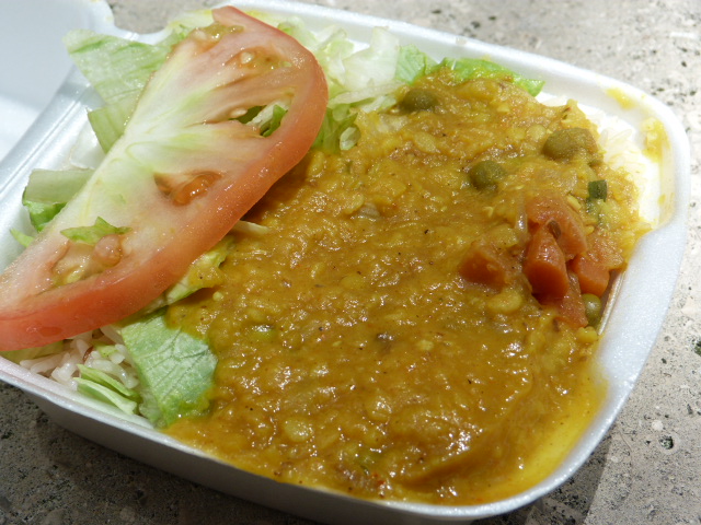 The main themes of this lunch were yellow and spicy. The first bite of the kati roll lit my mouth on fire and never let up thanks to all of the fresh chiles in the mashed potato filling. Still, this was one delicious kati roll and the paratha was a lot less greasy than others I’ve had from the carts on Liberty St. & Broadway. After downing this thing in no time flat I turned to the dal to cool my mouth off a little.