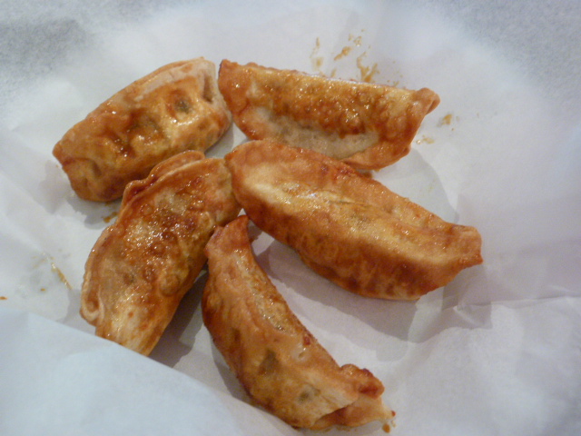 This was a really tasty taco despite the fact that it was on a flour tortilla. The beef was flavorful and the jalapeno sauce and kimchi coleslaw added moisture and also made my mouth burn. Three of these should be enough to fill up most people although we got an order of pork potstickers (5 for $4) just in case. These had been deep fried and shellacked with some sort of soy sauce that sealed in all of the porky juices.