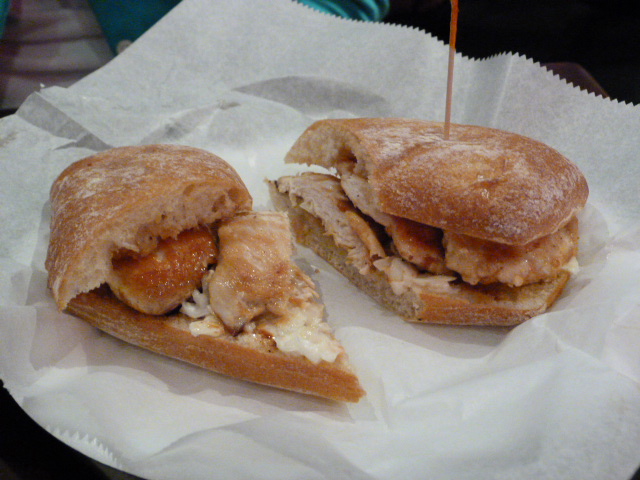 I went with the tacos (3 for $7) and unfortunately they don’t let you mix and match proteins so I got spicy beef with kimchi coleslaw and jalapeno sauce. Other options are chicken, crispy chicken and tofu. Then you have to decide if you want it spicy or not, what toppings and what sauces you want. So many choices! It’s the same deal with the sandwiches as my friend found out while ordering the non-crispy chicken sandwich ($8).