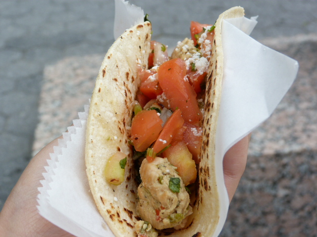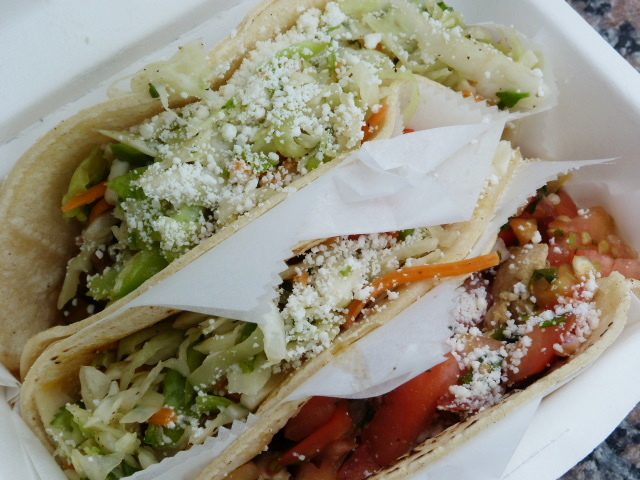 There are several varieties to choose from including green chicken, beef picadillo, roasted pulled pork and roasted vegetable (2 for $5, or three for $7). There are also grilled fish tacos that cost more than the others (2 for $7, 3 for $9). I went with, from left to right in the picture above, veggie, pork and chicken.