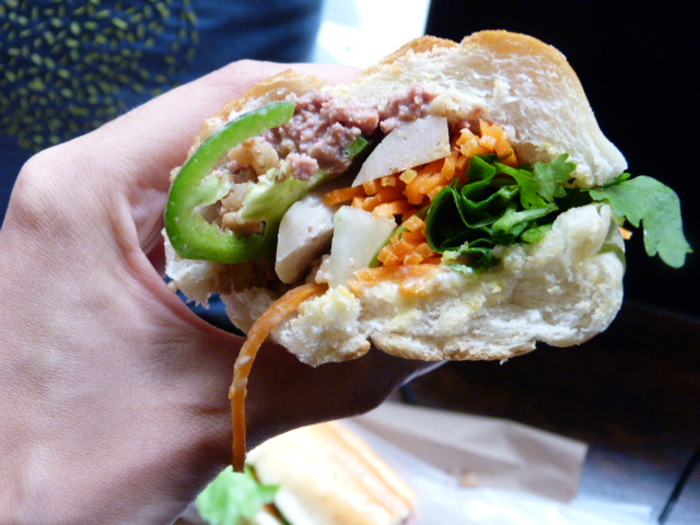 It was a pork party in my mouth, although honestly all I could really taste was the crumbly pig at the bottom, and the vast amount of pickled carrot. There was only a little bit of cilantro, and also one or two pieces of jalapeno since I had asked for mine spicy (which it really wasn’t) but they took a backseat to the meat. While I wished I had squirted some sriracha on before leaving the shop, there was enough going on flavor-wise to make me forget this sandwich wasn’t spicy.