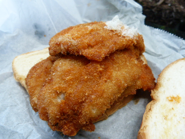 Unfortunately the sandwich suffered a bit in transit as the wrapper plus paper/plastic bags steamed the sandwich and made the bread super soggy. Despite that the fish was really good and I was happy with my choice of hot sauce. I did find myself wishing there was something else here – maybe some iceberg lettuce or something to provide some contrast to all of the mushy components of the sandwich. Still, this was a cheap and portable lunch for when you want to ingest four fish fillets without having to use a fork.