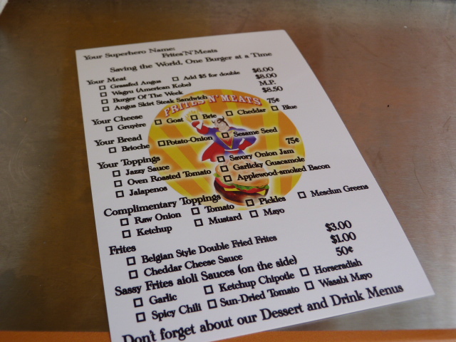 First, a couple of notes about what you can expect from Frites N Meats post-crash that wrecked their original truck. You’re still going to have to wait in line while your burger is cooked to order, but in order to actually get food you have to fill out a checklist with what you want and your name. I suppose it’s a good system, but it made things a little chaotic. Other than that the menu is mostly the same with weekly special burgers and that one involving alcohol.