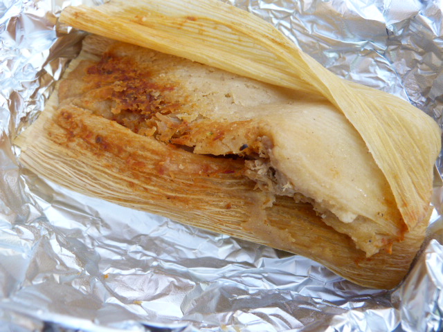 While a torta sounded good I went with a trio of tacos ($2.50 each) and a tamale ($2). They also have beef empanadas for $1.50 but I knew my stomach wouldn’t be big enough for that much carby deliciousness. On recommendation I got a pastor taco (pork, pineapple), carnitas (spicy pork) and one with chicken. My favorites were the carnitas and chicken as the pork in the pastor didn’t really have seasoning so it mostly tasted of pineapple.