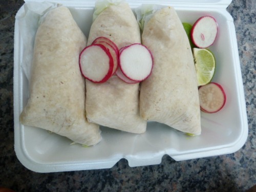 All of the tacos looked the same from above with shredded iceberg, cilantro and some guacamole that you don’t have to pay extra for. There was a lot of meat in each of them, and I really liked the tortillas which weren’t griddled which often makes them split, but instead steamed meaning they held up well being transported in their styrofoam vessel. They gave me two containers of hot sauce and one of green sauce on the side which really helped the flavor of the chicken and pastor tacos.