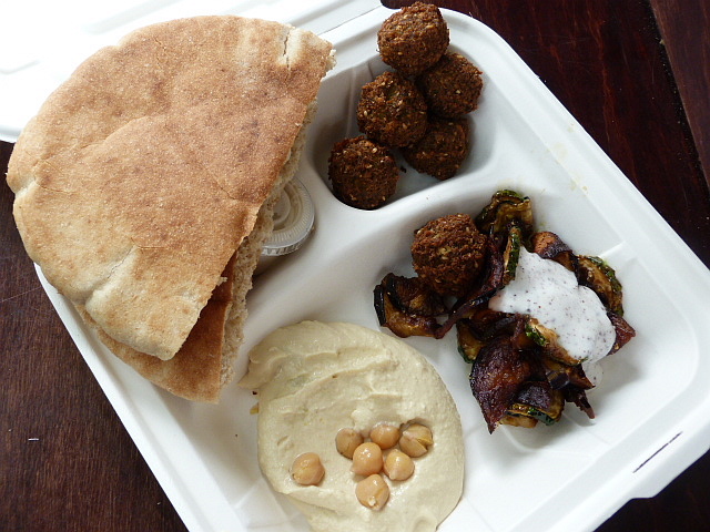 You can get your meals in either sandwich ($5) or platter ($7) form here and after trying both I’d have to say I’m leaning toward the sandwich being a better value. The first time I went I got a falafel platter with fried zucchini and eggplant and hummus as my two sides. It also comes with a pita cut in half and containers of hot sauce and tahini.