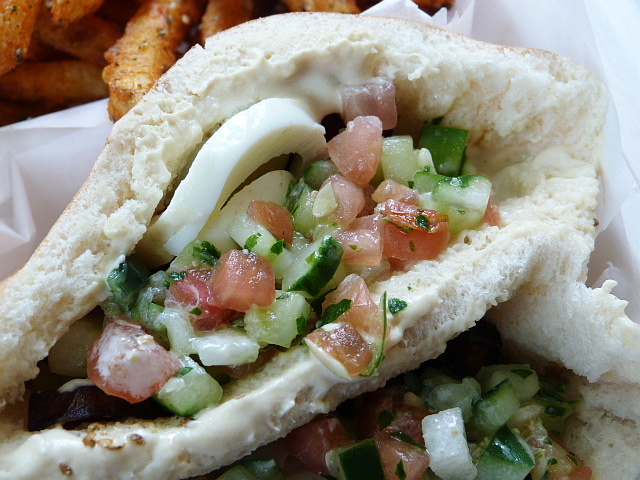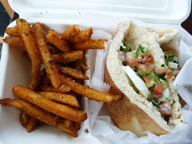 Later I went back to get a sandwich and try one of the many sides they offer for $3. While I was pretty interested in their roasted beet sandwich (yes, really) instead I went with the Ba’al which involves sliced hard-boiled egg, shepherd salad, fried eggplant, tahini and hummus. And because I’m a sucker for anything involving the spice blend zaatar I got a side of fries sprinkled with it which turned out to be the best lunch decision I’ve made in a long time.