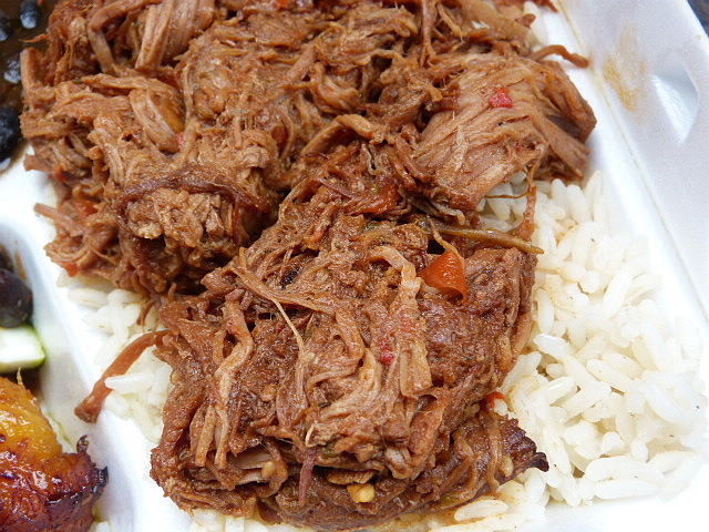 I need not have worried because this was a hefty container of meat and carbs. There was a pile of ropa vieja on top of a mound of rice, a small amount of black beans and a couple of plantains on the side. The meat was great – tender and with enough juice to soak into the rice below. I can imagine this would be as good or possibly better in sandwich form.