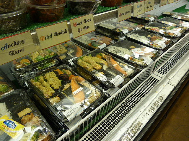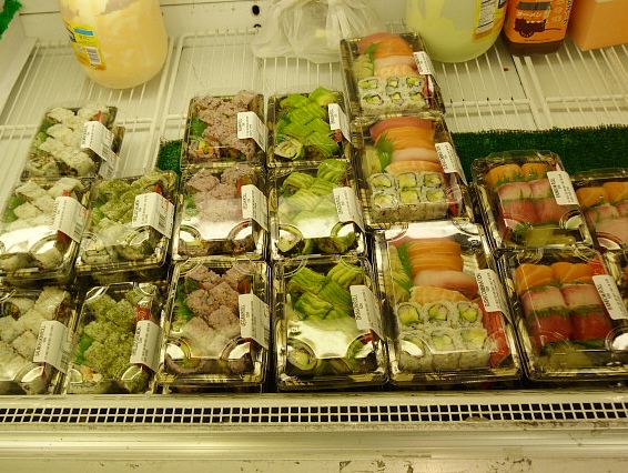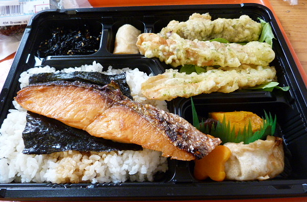 There are so many choices it’s a little mind-boggling. There are various hot dishes and cups of french fries on the counter as well as signs advertising ramen soup and Japanese curry. These tempted me, as did the reasonably-priced sushi rolls (mostly $6.99, with sashimi for about $11). But then I saw the selection of bento boxes in the refrigerated case and I knew what my lunch would be.