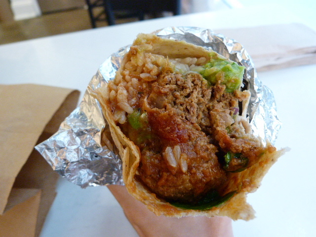 First, I’ll give you the pluses of my lunch: It was filling and the first few bites were tasty with the meat intermingling with guac and the pineapple BBQ sauce. While the meatballs weren’t exactly spicy, they were good. Now for the minuses: Halfway through the wrap, its contents were separated into three distinct layers of rice, guac and meat. This was fine if you got a meat bite, not fine if you got the other two elements since the guacamole was both plentiful and bland as could be.