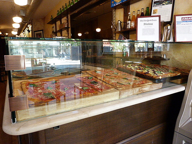 There are times when you want a greasy New York-style slice and others when something more refined sounds good. Since we are lacking in fancy, affordable Neopolitan-style spots in the general downtown area, I decided to go check out the newish Piazza Seventeen on Cleveland Place (at Lafayette), purveyor of square Roman slices. When they first opened the gimmick was that you could buy slices of pizza and pay by the pound so I was curious as to how much pizza I could get for my $10 budget. My dreams were dashed when I stepped inside the small shop, heeding the call of the “Eat Pizza Here!” sign out front.