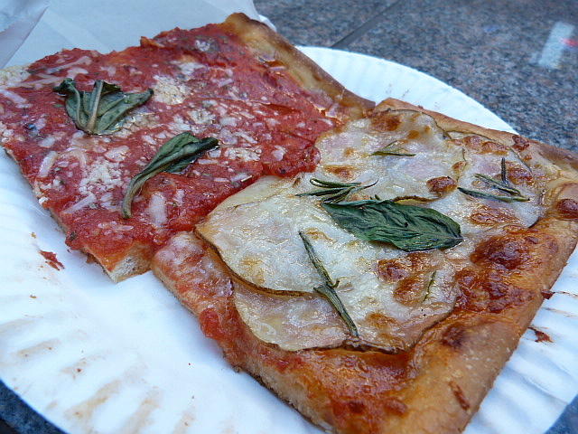 I shunned the latter and ordered up two of the rectangular slices to go: one potato rosemary ($3.25) and one marinara ($3.25) because it looked so pretty in its display case. The man behind the counter heated them in the tiniest pizza oven I’ve ever seen (within the cleanest slice shop I’ve ever been in) and I had them in my hand a couple of minutes later.