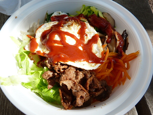 You get a regular-sized takeout container full of the traditional vegetables and a mound of rice, plus a fair amount of beef (although you can also get it vegetarian), and a sunny-side up egg. The chili paste is optional, but if you say you want it they go to town with it. While I ate this I pretended it was a salad because after all it was half vegetables, right?