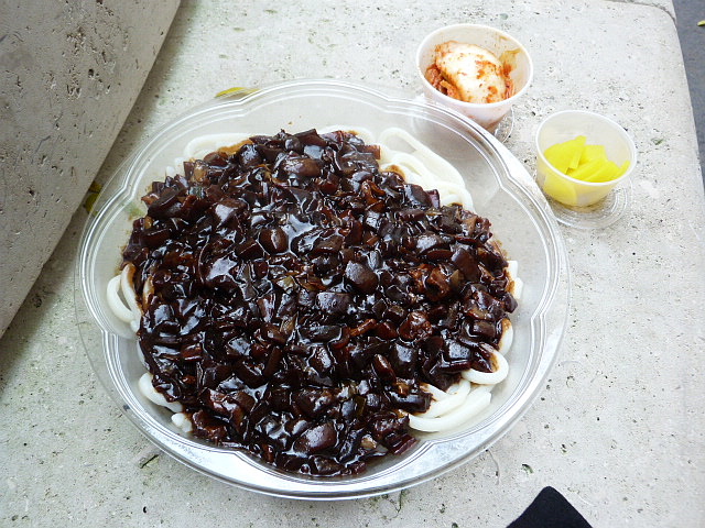 I’ve eaten a lot of things that are hard to take tasty-looking pictures of – i.e. every Indian steam table lunch ever – but when I took the lid off my latest Korean meal from Cafe Hanover on Hanover Sq. (at Pearl) my heart sank a little because it looked pretty unappealing. By that I mean it looked like there was an oil spill all over some udon noodles, and that became my introduction to the dish called jja jang myun on their menu, also known as jajangmyeon.