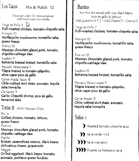 Lunch’er Chloe also stopped in for the Tuesday taco special and discovered the price raise. They were nice enough to give it to her for $2, and she was nice enough to pass along the updated menu which you can find (in part) after the jump.