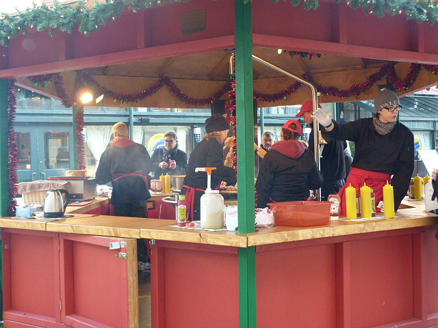 The sausages are in the $6 price range, so maybe not the best deal in the world, but the stand seems to be run by real Germans if that makes any difference. You can get a look at a specimen here, and this is your cue to either head to the holiday market for a snack or avoid it like the plague until the tree and carolers are gone.